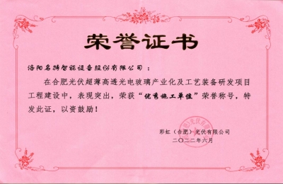 名特公司榮獲彩虹(合肥)光伏有限公司授予的“優(yōu)秀施工單位”榮譽稱號